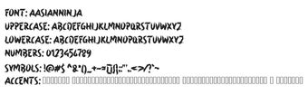 Com bordas grossas e irregulares, a fonte transmite uma sensação de movimento e urgência, perfeita para pôsteres, branding de streetwear e títulos de jogos de ação. O caráter da fonte é ao mesmo tempo lúdico e intenso, convidando designers a experimentar contrastes de cores ousadas e layouts dinâmicos. Seja em uma estética underground ou em uma abordagem estilizada contemporânea, Asian Ninja certamente atrai atenção e infunde energia rebelde em qualquer projeto criativo.